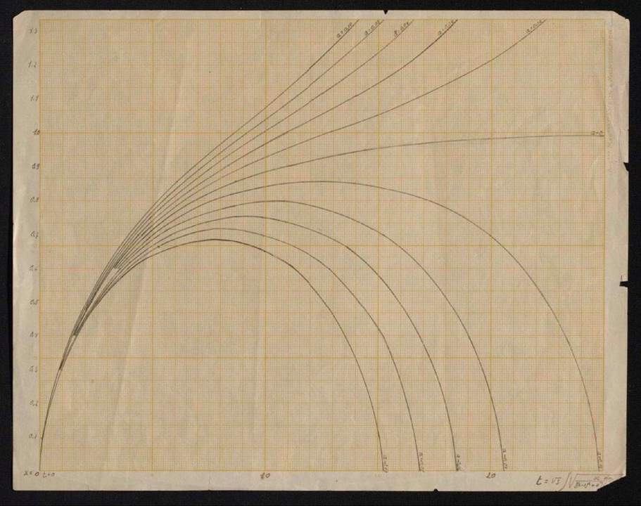 Grafiek van de evolutie in de tijd van de straal van het heelal. Tekening van Georges Lemaître uit 1927. (Archives Georges Lemaître, UCL)