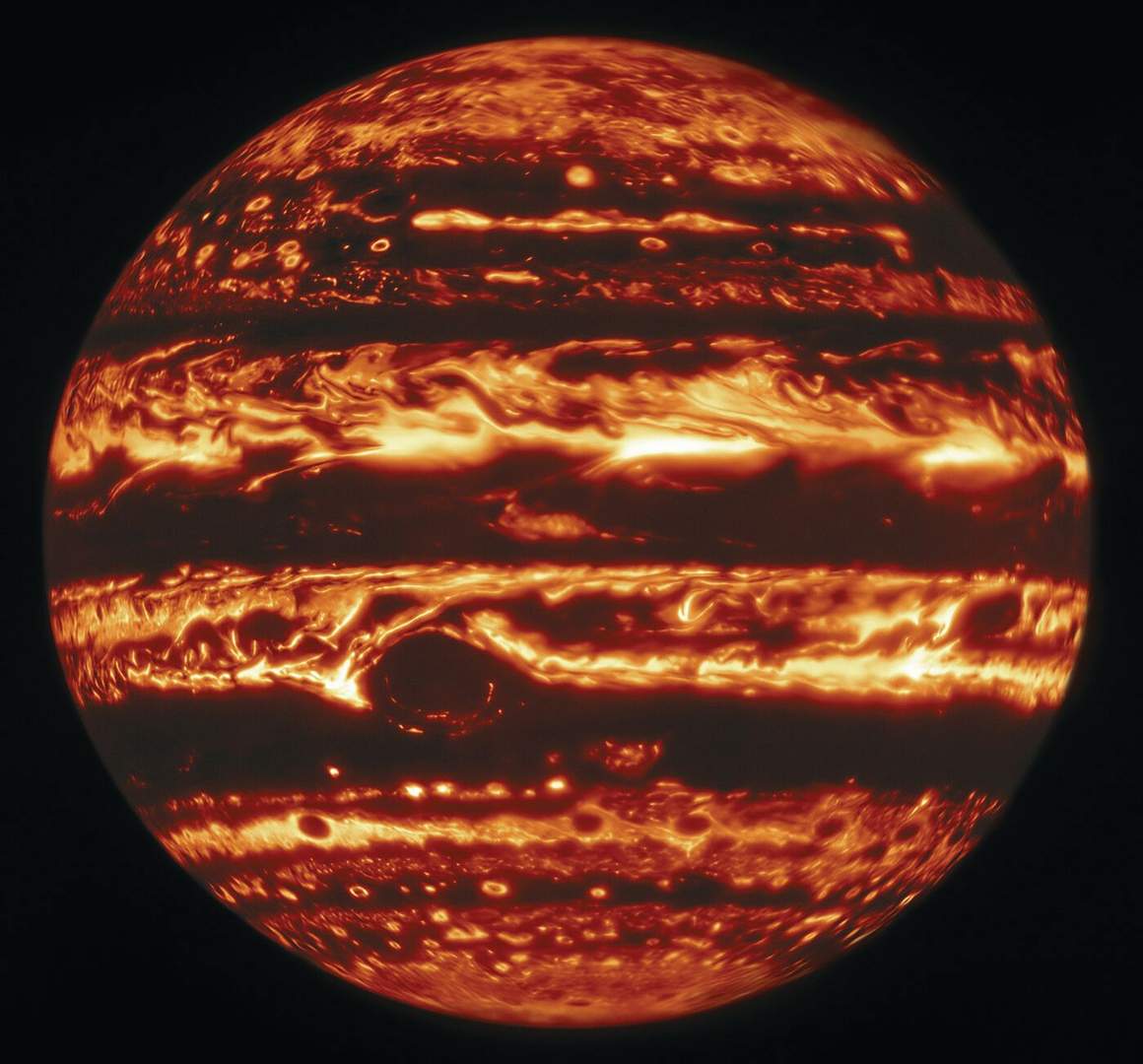 Iets linksonder in het midden van de foto is een grote, donkere ovaal te zien. Dat is de beroemde Grote Rode Vlek in de Jupiterdampkring. Het is een gigantische wervelstorm die kilometers boven het omringende wolkendek uittorent, en dus een extra lage temperatuur heeft. De Grote Rode Vlek dankt haar naam aan de oranjerode of zalmroze kleur op foto’s die gemaakt zijn in zichtbaar licht. Daar komen windsnelheden voor van meer dan 600 kilometer per uur; het stormsysteem bestaat al minstens 350 jaar.