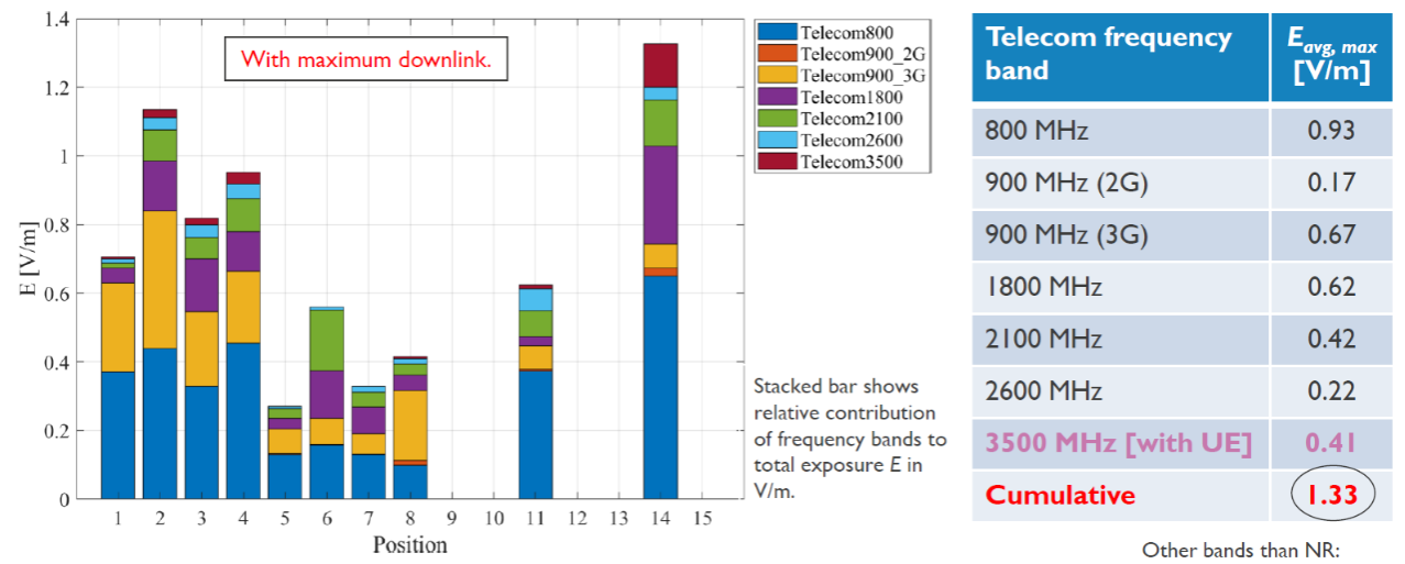 Onderstaande figuur geeft een overzicht van de cumulatieve elektromagnetische stralingswaarden op de vijftien meetlocaties wanneer geen 5G-verkeer wordt geïnduceerd (met andere woorden: wanneer een abonnee het 5G-netwerk niet gebruikt). Elk van de balkjes laat zien wat de relatieve bijdrage is van de verschillende frequentiebanden. Het is duidelijk dat de 900MHz-band (voor 2G-, 3G- en 4G-verkeer) en de 800MHz- & 1,8GHz-frequenties (eveneens voor 4G) de belangrijkste bronnen zijn van elektromagnetische straling – met gemiddelde waarden van respectievelijk 0,67 Volt/meter (V/m), 0,93V/m en 0,62V/m.
