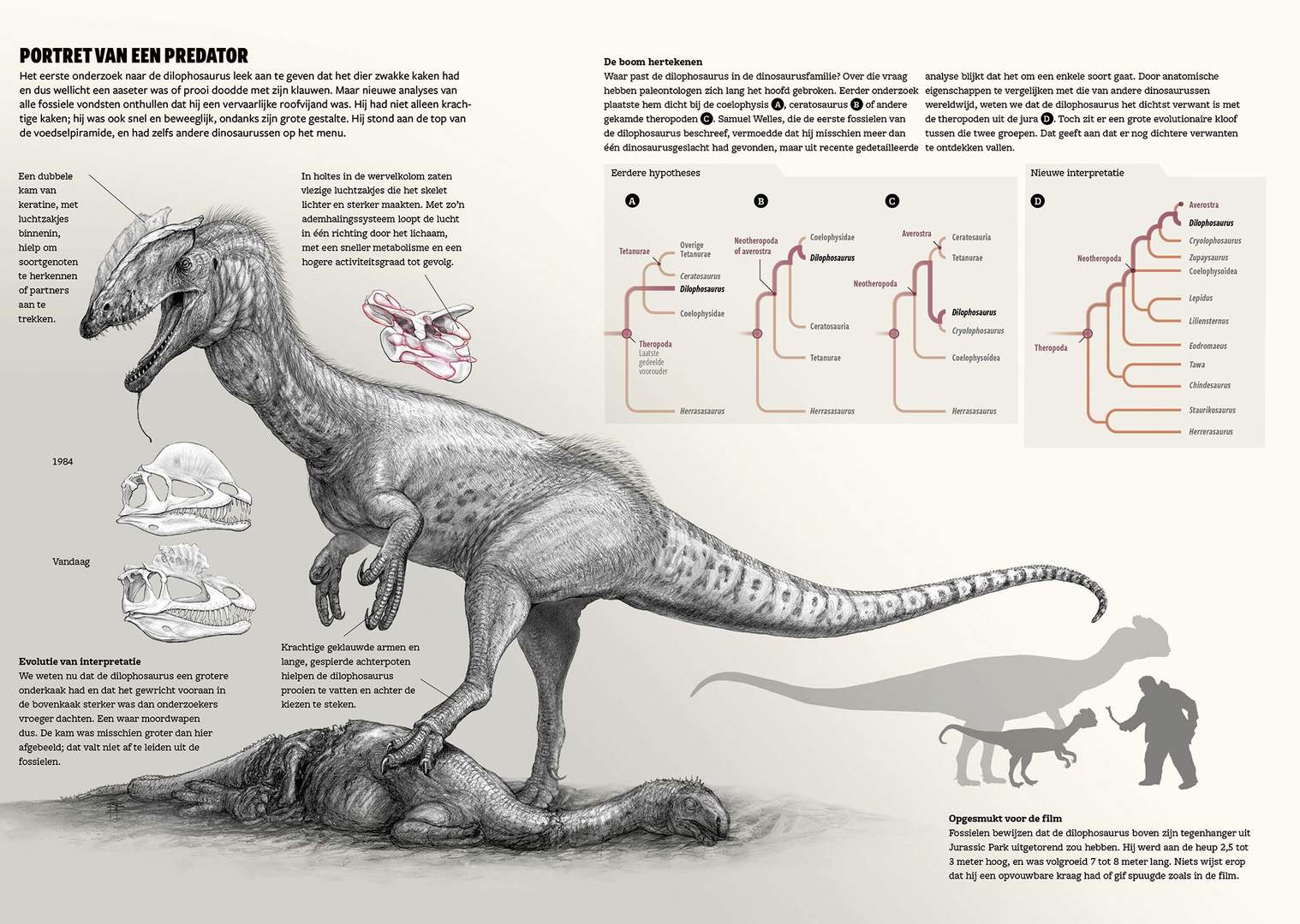 De dino in Jurassic Park was gemodelleerd op Welles’ anatomische beschrijving uit 1984, op reconstructies van het skelet in musea, en op de tekeningen van paleontoloog Gregory Paul in zijn boek Predatory Dinosaurs of the World uit 1988. Toch kreeg het dier een andere gedaante op het scherm. Het was bijvoorbeeld maar half zo groot als de echte dilophosaurus. Dat was een bewuste zet van de filmmakers, om verwarring te vermijden met die andere hoofdrolspeler, de velociraptor. De kenmerkende opvouwbare kraag en het giftige spuugsel waren puur voor de show. Maar doordat die eigenschappen wel echt bestaan in de dierenwereld leken ze geloofwaardig.