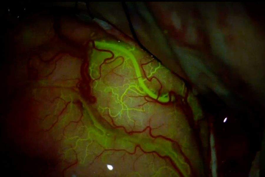 Beeld: Een fluorescerende controlevloeistof kon voorbij de bloed-hersenbarrière in de hersenen geraken © Northwestern Medicine