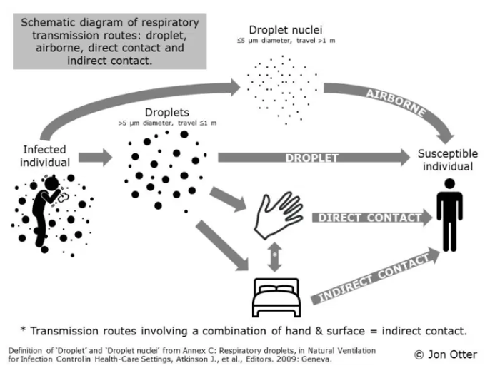 Je loopt een besmetting in de meeste gevallen op door rechtstreeks contact met een geïnfecteerde patiënt. Wanneer die hoest en niest, kunnen grote druppels beladen met viruspartikels in je neus, mond en slijmvliezen belanden. Je kan ook een infectie oplopen wanneer je een besmet persoon de hand schudt of wanneer je voorwerpen aanraakt waarop druppeltjes met het virus zijn beland.