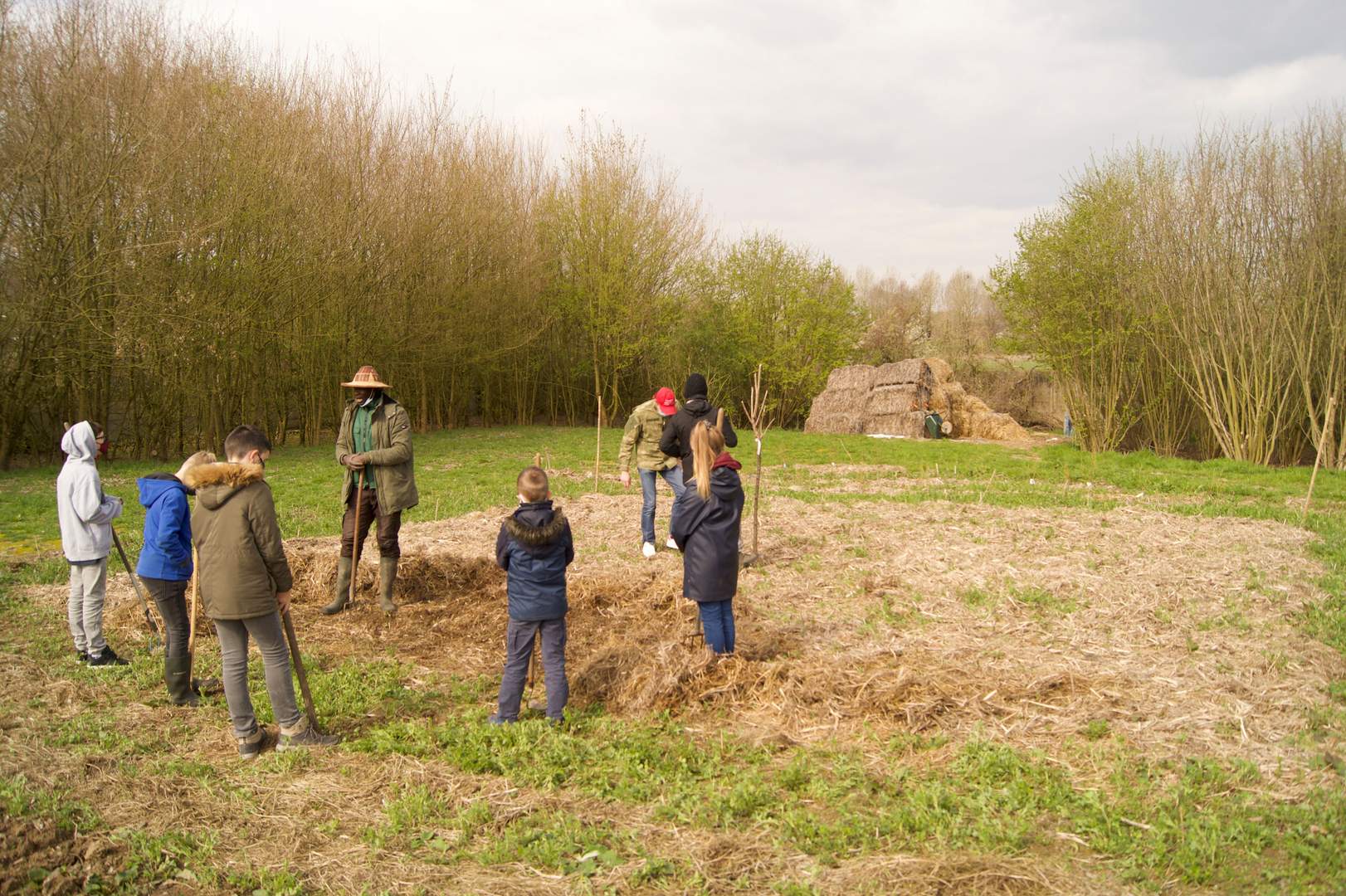 Bij de binnenkomst op het terrein van de Groeituin valt het groot grasveld, omringd door bomen, meteen op. Op het plannetje naast de ingang is te zien dat de Groeituin hier allerlei plannen heeft: onder meer een grote serre, een bekken voor wateropvang en een loopweide voor dieren. Vanwege de pandemie staan die plannen wel nog even op een laag pitje. Kleine activiteiten met een tiental jongeren, zoals deze bodemstaalname, zijn voorlopig de enige die kunnen doorgaan.