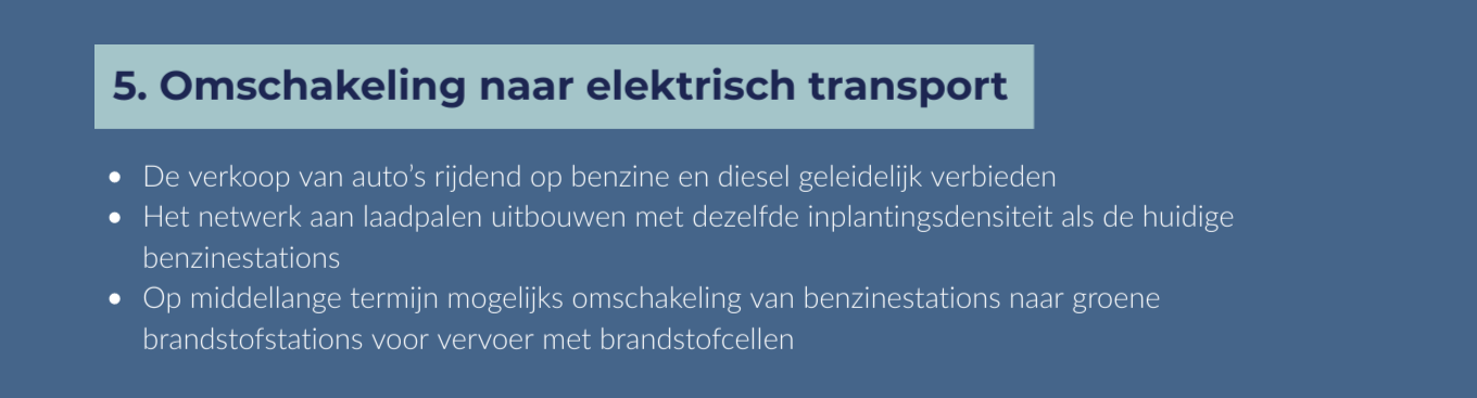 Privé- en vrachtvervoer verbruiken vandaag grote hoeveelheden fossiele brandstoffen. Eens er voldoende betaalbare groene energie beschikbaar zal zijn, kan men voertuigen die vervuilende brandstoffen gebruiken, verbieden. Uiteraard zijn er complementaire maatregelen nodig die het mogelijk maken dat die groene energie even eenvoudig als nu kan getankt worden.
