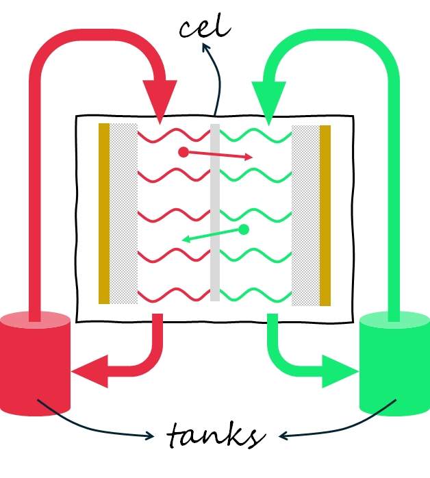 Het type batterijen in onze smartphones en elektrische auto’s (lithium-ionbatterijen) is zeer krachtig, maar waarschijnlijk te duur voor grootschalige langdurige opslag van hernieuwbare energie. Daarvoor is een ander type batterij, de zogenaamde redox flow batterij, wellicht geschikter. Het speciale aan deze batterij is dat de energie niet wordt opgeslagen in een vaste stof, maar wel in een vloeistof, of juister gezegd: in een actieve stof die opgelost is in een vloeistof.