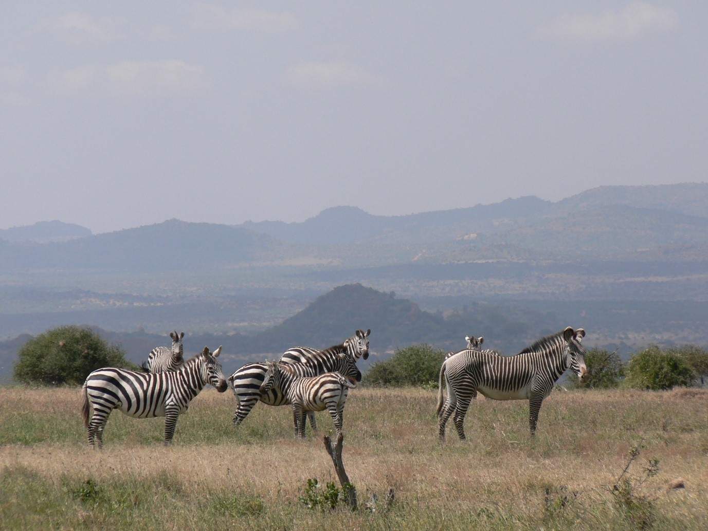 Foto 7: De savanne rondom het onderzoekscentrum Mpala is prachtig en onderweg naar het KLEE kom je vaak kuddes wilde dieren tegen, zoals deze zebra’s. Heb je door dat hier twee verschillende soorten zebra’s staan? Kijk eens goed naar het strepenpatroon van de zebra’s links, vergeleken met de zebra die rechts staat. Links zie je steppezebra’s, ook wel gewone zebra’s genoemd, terwijl er rechts een Grévyzebra staat, wat een bedreigde soort is. Grévyzebra’s zijn groter dan de gewone zebra’s, hebben dunnere strepen, een witte buik, grote ronde oren en een bruine snoet. © Judith Sitters
