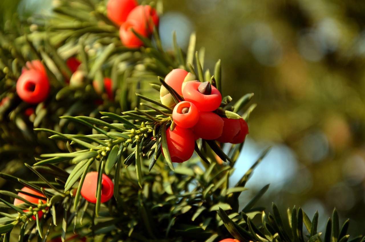 Alle delen van de Taxus baccata zijn giftig, behalve de roze ‘bes’ die eigenlijk een zaadrok is. Logisch als je bedenkt dat het gif bedoeld is om dieren af te schrikken van de plant te eten, terwijl de zoete zaadrok net als doel heeft om vogels te verleiden het zaad in te slikken en ergens anders te droppen na passage in hun spijsverteringskanaal, inclusief een handig pakketje meststoffen.