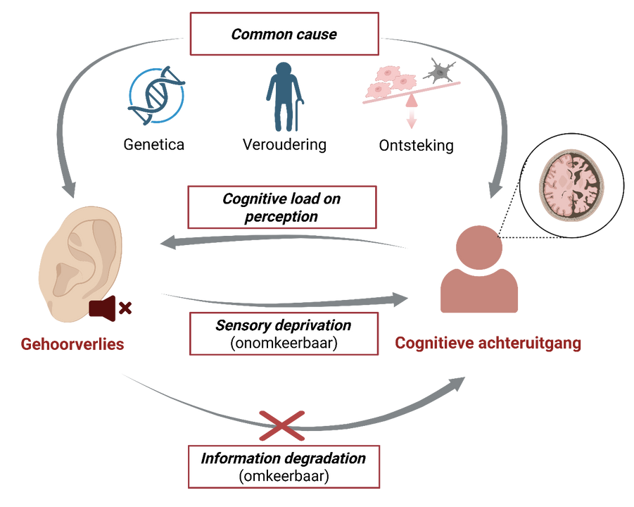 Hoe gehoorverlies exact leidt tot dementie blijft nog een grote vraag, maar onderzoekers hebben al verschillende theorieën voorgelegd4. Volgens de common cause-hypothese zijn gehoorverlies en cognitieve achteruitgang beide het gevolg van gedeelde onderliggende processen, waaronder genetische aanleg, omgevingsfactoren en de veroudering van het brein. Een andere mogelijke verklaring is de cognitive load on perception-hypothese. Deze theorie suggereert dat, in een vroegere fase van dementie, hersengebieden die betrokken zijn bij het gehoor worden aangetast, waardoor gehoorverlies optreedt.