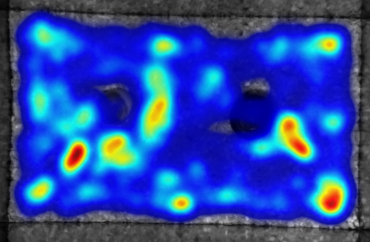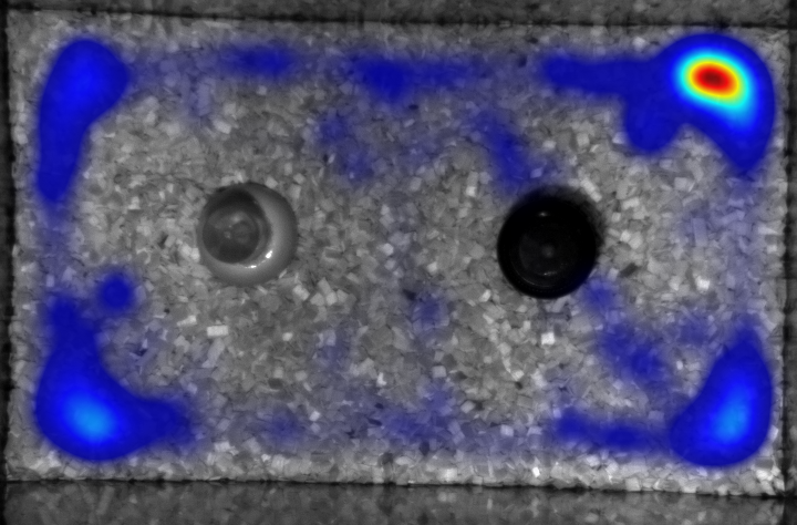 Afbeeldingen boven en onder. Exploratie van een muis zonder gehoorverlies (afbeelding boven) en een muis met lawaai-geïnduceerd gehoorverlies (afbeelding onder) in een ‘novel object recognition’-opstelling in ons laboratorium. Met behulp van cameratracking wordt het bewegingspatroon van de muizen in de opstelling gevolgd. In de hittekaarten duiden blauwe zones plaatsen aan waar de muis weinig tijd doorbracht, terwijl roodachtige zones gebieden tonen waar ze langer verbleef. De muis zonder gehoorverlies vertoont uitgesproken exploratief gedrag en is zeer nieuwsgierig, terwijl de muis met gehoorverlies zich voornamelijk in de hoeken van de opstelling bevindt en de objecten in het midden niet verkent, wat duidt op angstig gedrag.