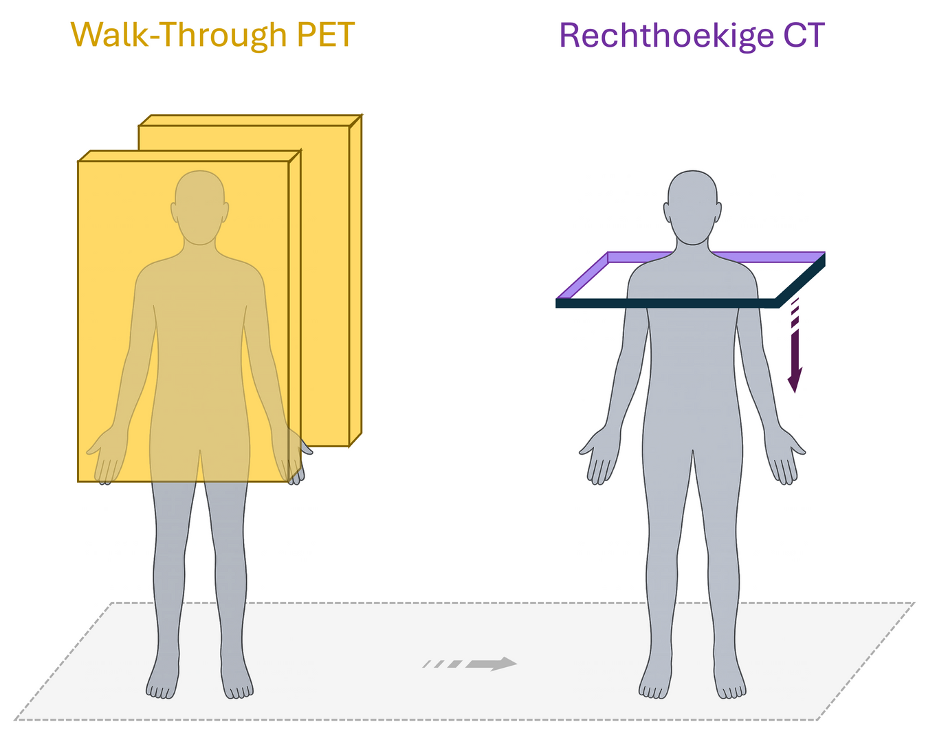 De oplossing? Een rechthoekige CT-scanner die ook rechtopstaand werkt. De inspiratie komt opnieuw uit de luchthaven. Bagage gaat daar niet door een ronde tunnel, maar door een rechthoekige scanner. Dat idee vormt de basis voor een nieuw type CT-scanner: een rechthoekig frame dat van boven naar beneden langs het lichaam beweegt terwijl je rechtop staat. Dankzij recente ontwikkelingen in zowel röntgenbronnen als detectoren kunnen we nu dit soort opstelling bouwen. Met die technologieën hoeven we niet langer vast te houden aan het klassieke ronde ontwerp. We kunnen overstappen naar kleinere, handiger scanners die beter passen bij toepassingen zoals de Walk-Through PET. Zo komt een volledig nieuwe PET/CT-combinatie in zicht.